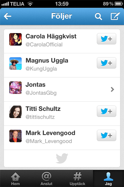 En ny twitterföljare som bara har valt att följa fem väldigt viktiga personer (men tack!).