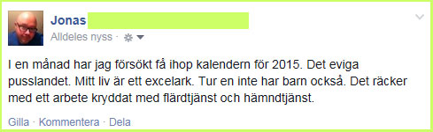 Men det där med min kalender är faktiskt något som är komplicerat. Väldigt mycket kausalitet där en liten förändring i ekvationen raserar allt genom en dominoeffekt. Ändå måste jag nu lägga en exakt plan för hela nästa år, men vet att det kommer att ändras från dag till dag när jag väl är inne i det nya året. Men för att kunna parera så gott det går, så måste jag ändå ha kännedom om så mycket som möjligt för kommande år redan nu. Att det sedan är det eviga pusslandet trots detta, får jag försöka stå ut med. Jag kan inte hinna allt, men jag måste försöka kunna prioritera bland alla förändringar som ändå kommer att inträffa.